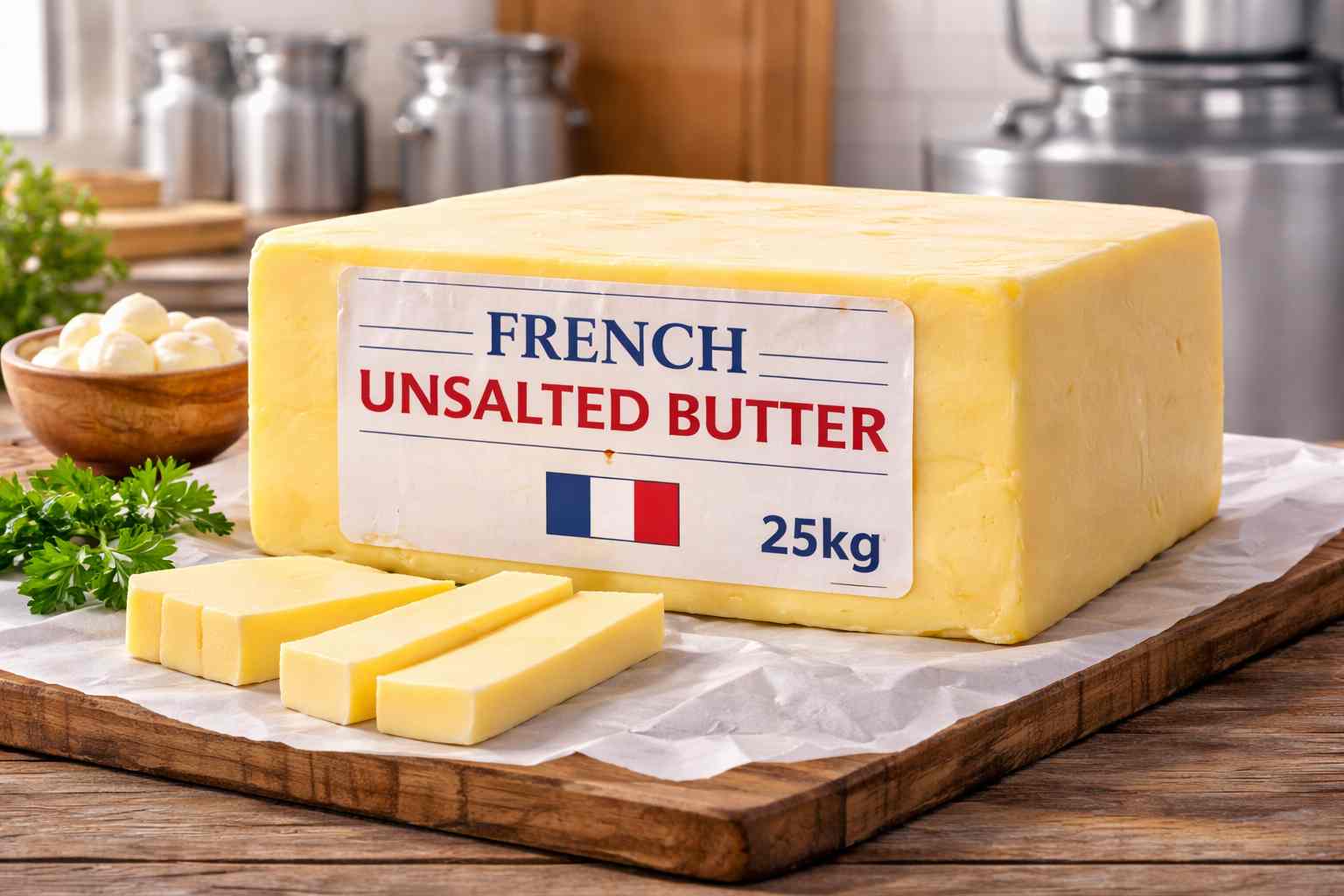 French butter is the global standard for professional use. Produced from pasteurized cream and standardized to high fat content, it delivers the consistency required for lamination, baking, and industrial applications.