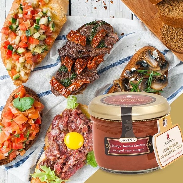 This Mediterranean tomato chutney combines ripe tomatoes with aged wine vinegar to create a structured, full-bodied condiment with both sweetness and tang.