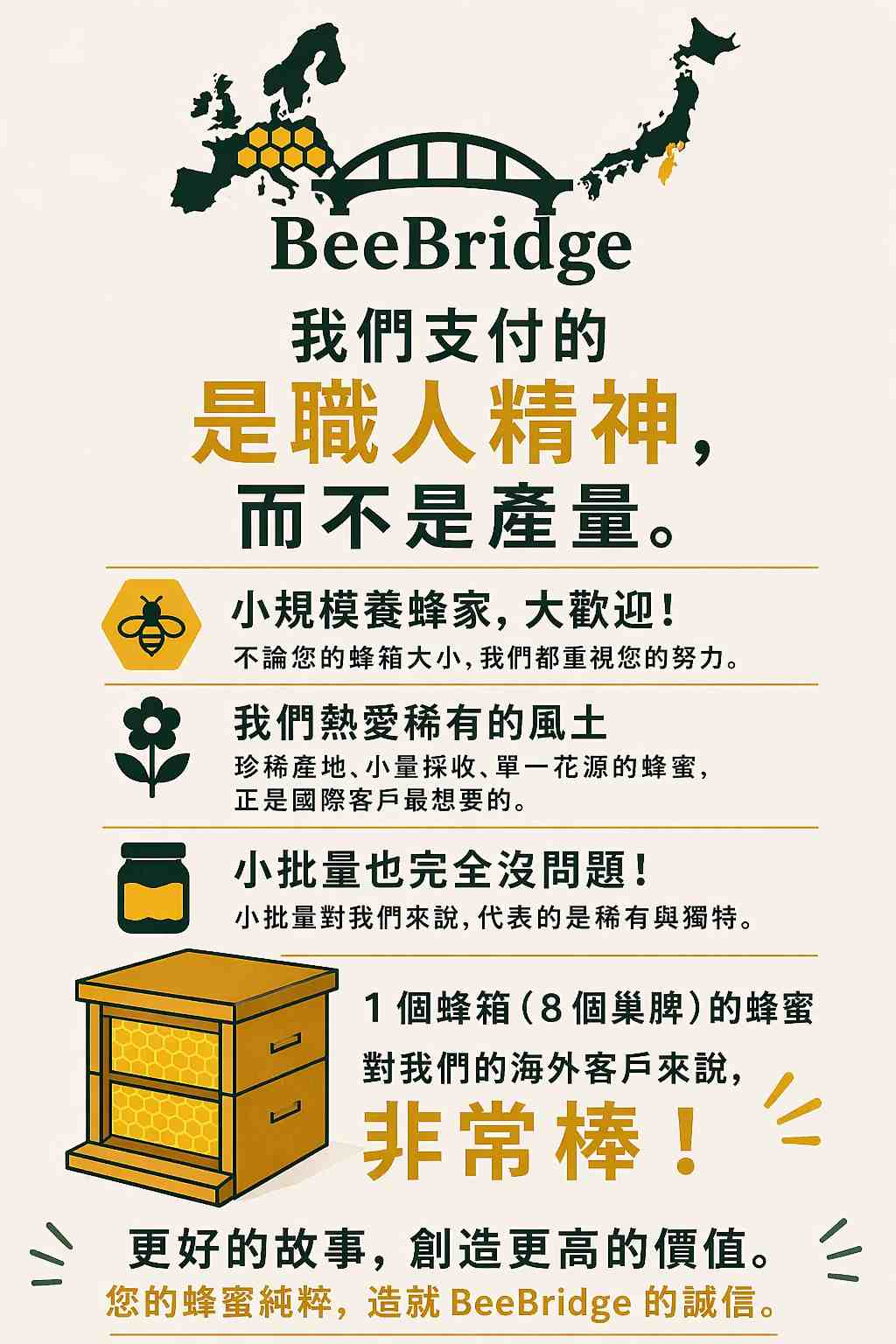 BeeBridge 持有相關出口能力,可直接從養蜂場整合至台灣進口端。